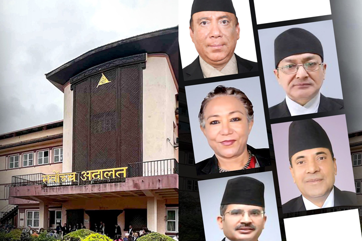 सर्वाेच्च अदालतय् प्रतिनिधिसभा विघटनविरुद्ध लाःगु रिट निवेदनया सुनुवाइ यायेत संवैधानिक इजलास नीस्वंगु दु।प्रधानन्यायाधीश प्रकाशमानसिंह राउत, न्यायाधीशपिं सपना प्रधान मल्ल, कुमार रेग्मी, हरिप्रसाद फुँयाल व डा मनोजकुमार शर्माया संवैधानिक इजलास नीस्वंगु सर्वाेच्च अदालतया प्रवक्ता अर्जुनप्रसाद कोइरालां धयादिल।