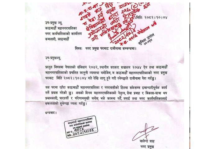 येँ महानगरपालिकाया प्रमुख बालेन्द्र शाहं थःगु पदं राजीनामा बियादीगु दु।